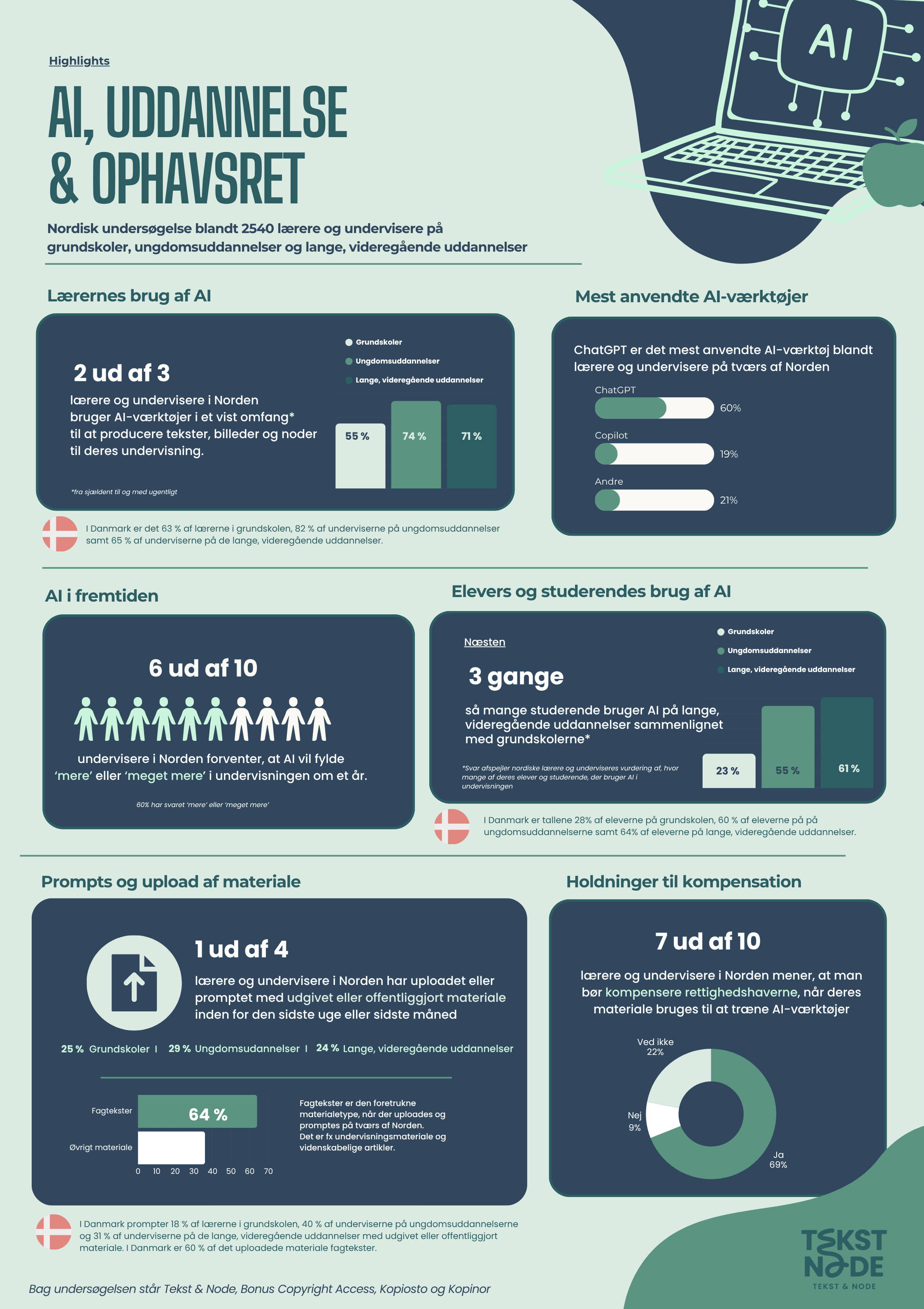 Sammen med vores søsterorganisationer Kopiosto (Finland), Kopinor (Norge) og Bonus Copyright Access (Sverige) har Tekst & Node lavet en undersøgelse om brugen af generativ AI og ophavsret på uddannelsesområdet i Norden.